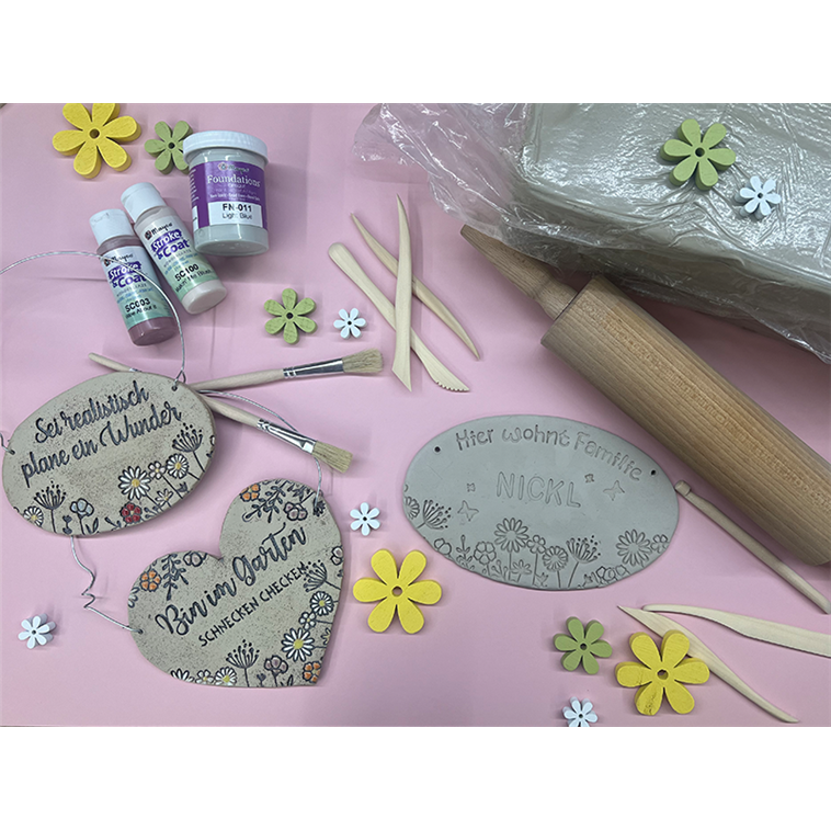 In diesem Workshop gestaltest du personalisierte Namens- und Sprüche-Schilder aus Ton. Mit unserer großen Auswahl an Stempeln kannst du deiner Kreativität freien Lauf lassen. Du erhältst eine Einführung in die Grundlagen des Töpferns.